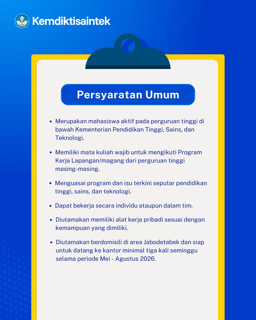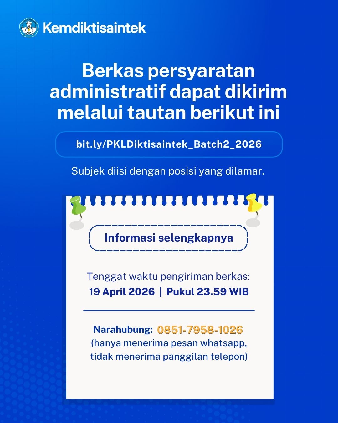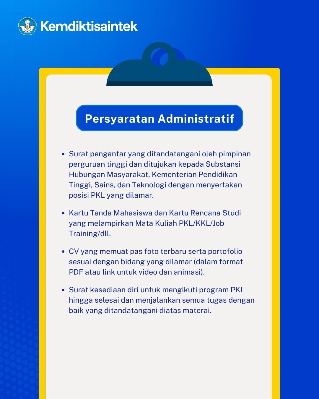 PENDAFTARAN PRAKTIK KERJA LAPANGAN (PKL) KEMDIKTISAINTEK Jumat, 10 April 2026 - 11:14:14 WIB Dibaca: 173 kali